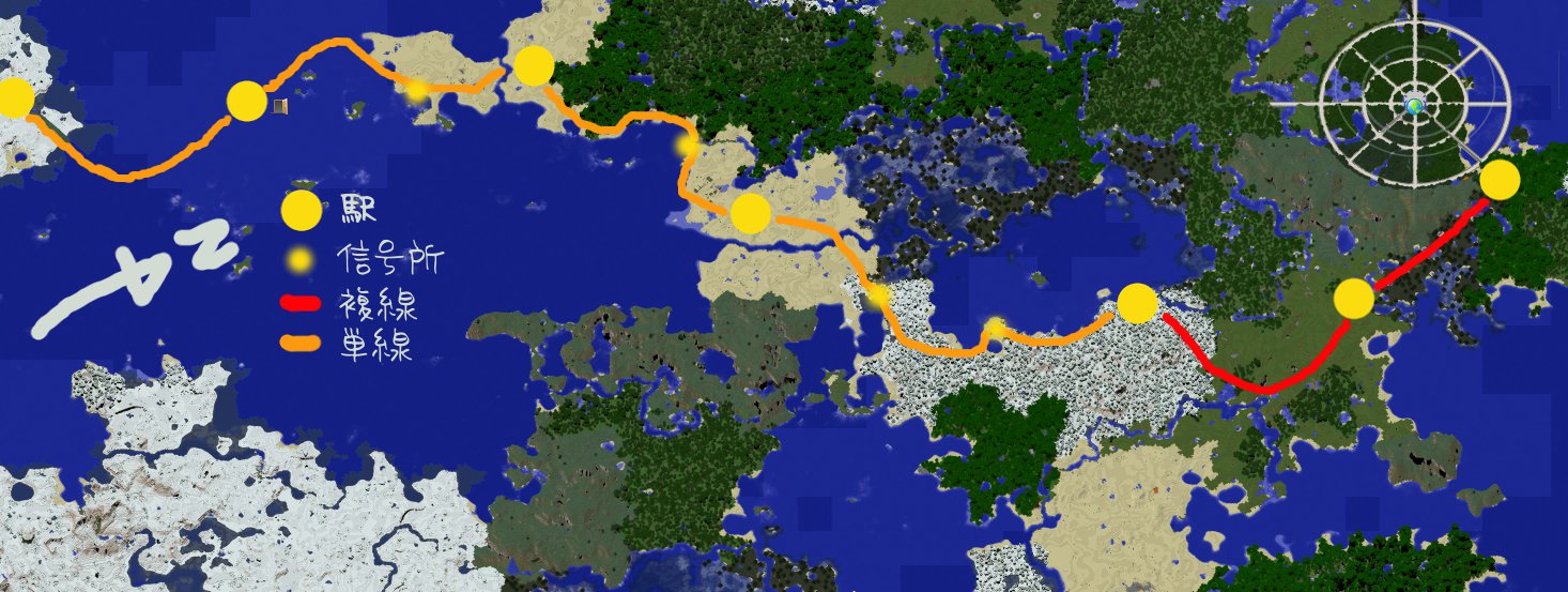 スポーン地点東側に建設予定の第3ゲート方面鉄道路線のターミナルから、スポーン地点南西の湖畔まで複線路線を敷設します。そこから先は単線路線を敷設していきます。(なお、上記概略図はあくまで予定です。沿線の土地占有状況や発展状況、地形その他の事情により、線形や駅数等は変更される場合があります)